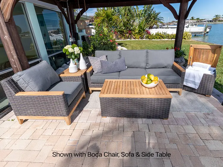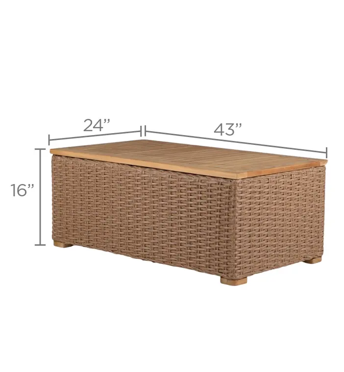 Versatile design suits any decor style. Durable all-weather wicker construction and teak wood top. Hidden storage compartment for clutter-free living. Ideal for indoor or outdoor use.
