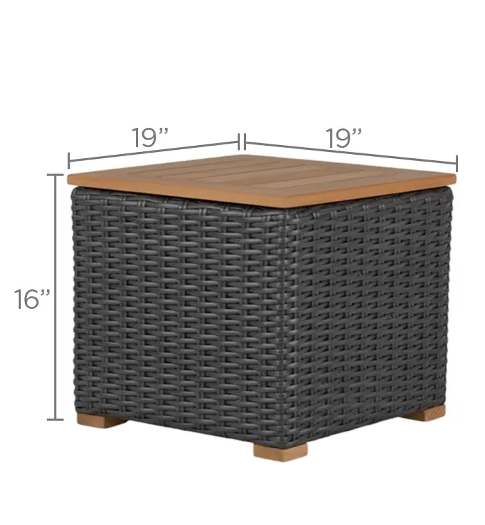 Versatile design suits any decor style. Durable all-weather wicker construction and teak wood top. Hidden storage compartment for clutter-free living. Ideal for indoor or outdoor use.
