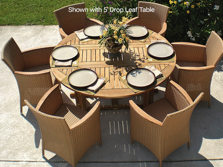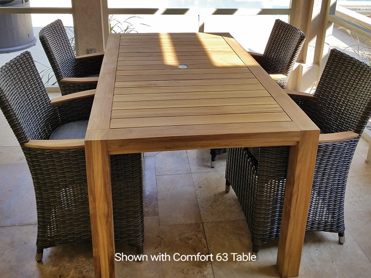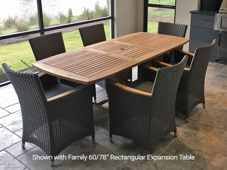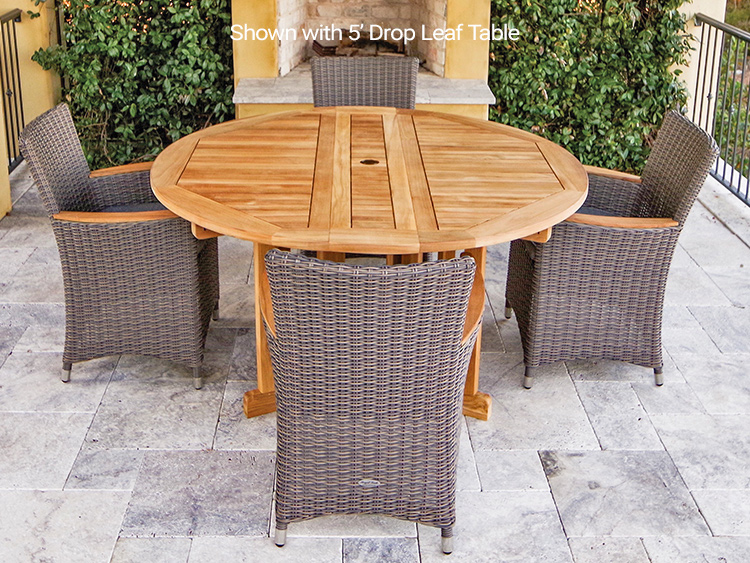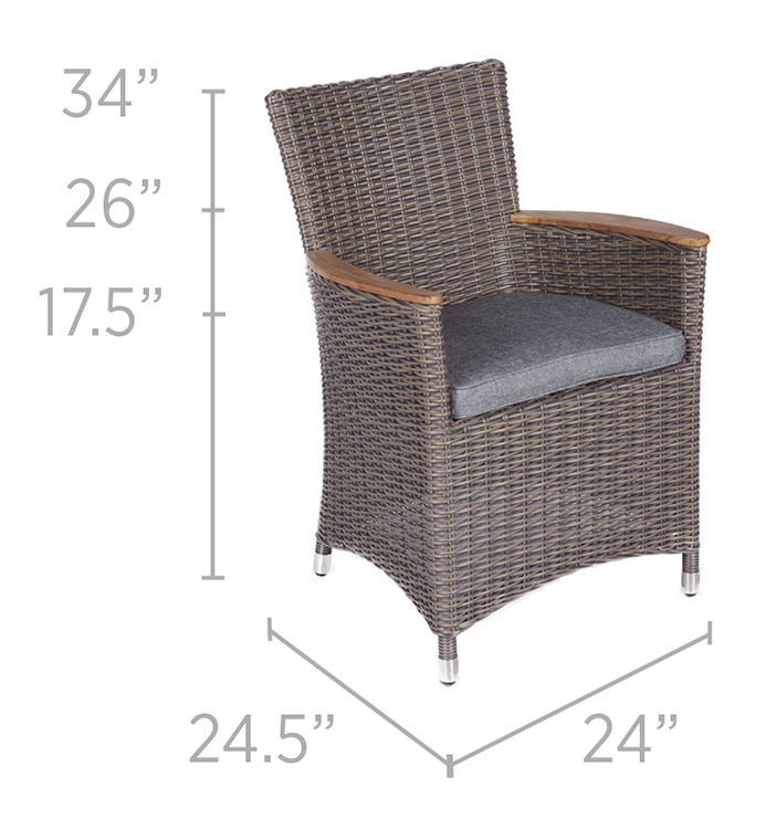 Our All-Weather Wicker Helena Chair features Teak Armrests and is wrapped over a powder coated aluminum frame.