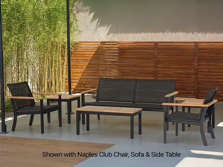 Sleek and Modern seating group featuring a sturdy black powder coated aluminum frame, handwoven all weather rope and warm teak finish accents. This set blends contemporary style with durable comfort.
