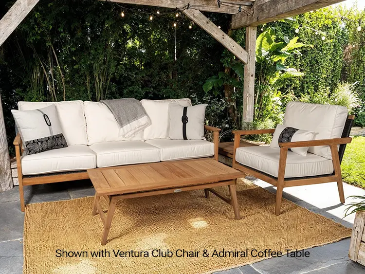 Discover the perfect blend of elegance and modern comfort with the Ventura Collection. Handcrafted from premium teak wood and durable rope, this sofa highlights the natural beauty and strength of teak, enhanced by stylish handwoven rope accents. Built for enduring outdoor enjoyment, the Ventura Sofa features a robust frame and plush cushions that invite relaxation in any setting—be it a patio, poolside, or garden retreat. With its sustainable materials and meticulous craftsmanship, this club chair reflects Royal Teak’s commitment to creating timeless, high-quality furniture that enhances your outdoor living experience with sophistication and ease.